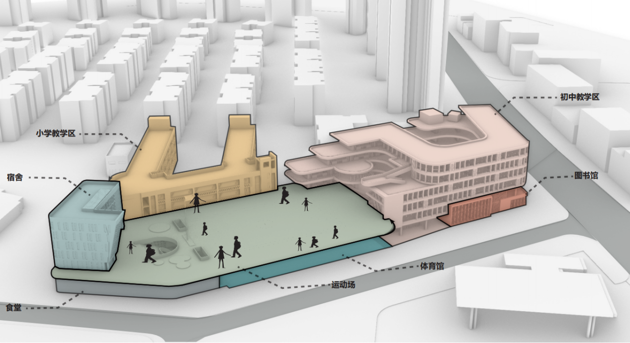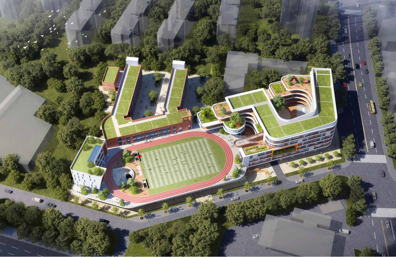 方案設計由三個獨立又相互連通的架空空間組成,公共空間廊道采用回廊布局,營造濃郁的學習氛圍的同時,增加空間的趣味性,以建筑空間教誨學生“通向羅馬的路不只一條”。屋頂空間結合“念農”菜園和雨水回收系統,豐富孩子們的課外實踐活動,引導孩子全能發展,教誨學生“飲”水思源。課間活動空間采取層層退臺形式,設置豐富有趣的對視路徑,視線寬廣明朗,空間開闊,退臺面與幼兒園可以形成對視,進而引發學生對于“過去”、“成長”和“未來”的思考。