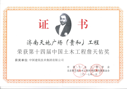 4月14日,第十四屆中國土木工程詹天佑獎頒獎大會在北京舉行。中技集團建筑設計院設計三所設計的濟南天地廣場(貴和)項目榮獲“第十四屆中國土木工程詹天佑獎”。